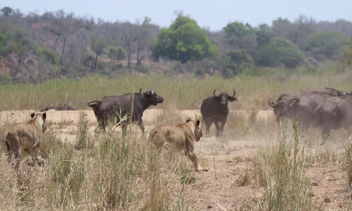 Trâu rừng nổi tiếng với cặp sừng nhọn đáng sợ và trọng lượng cực lớn, là một trong những động vật nguy hiểm nhất Nam Phi. Bất chấp sức mạnh của đối thủ, bầy sư tử phát hiện cơ hội săn mồi. Với một chân sau treo lơ lửng, con trâu rất dễ bị tấn công, thôi thúc sư tử cái cân nhắc bữa ăn lớn hơn nghé non.